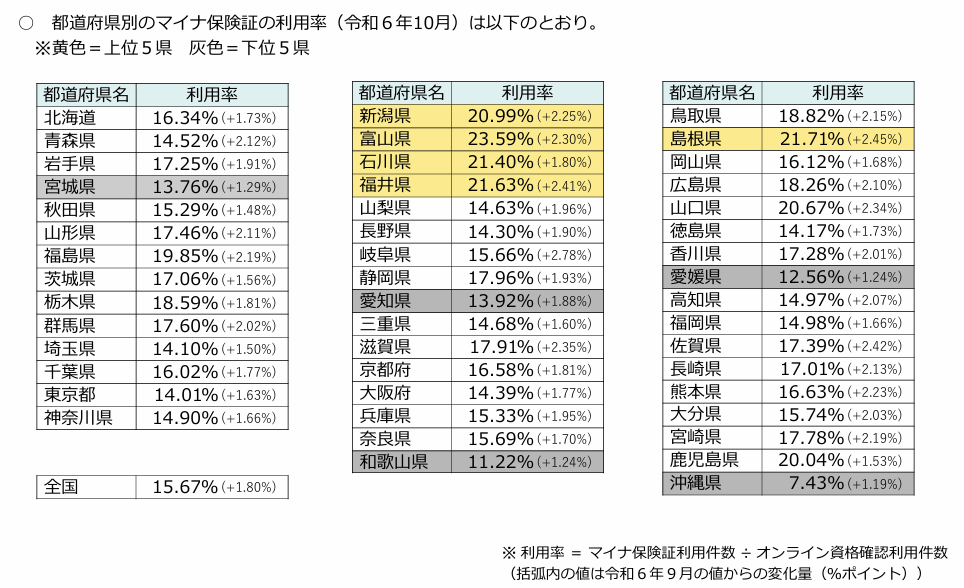 マイナ保険証の都道府県別の利用率は以下の通りです。(令和6年10月時点)